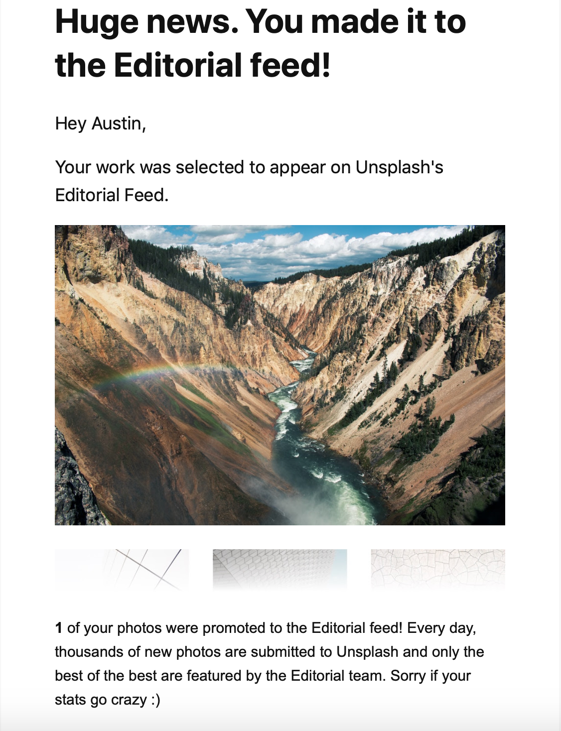 On August 7, 2019 an image I captured at the Upper Yellowstone Falls in Wyoming was hand-selected to be featured in the Unsplash Editorial Feed. Result: 200,000+ views and 1,200+ downloads.